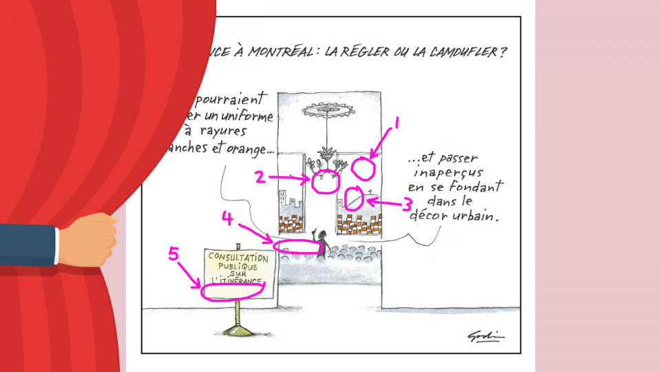 L’itinérance est une réalité à Montréal. Les sans-abri y sont nombreux. Ils s’installent parfois dans des endroits achalandés et leur présence cause des frictions avec le reste de la population. Comment aider ces personnes vulnérables? Dans cette caricature, Godin se moque de ceux qui préféreraient fermer les yeux sur le problème. Il imagine une réunion dans laquelle quelqu’un suggère que les itinérants s’habillent en blanc et orange, comme les fameux cônes des chantiers de construction. Ainsi déguisés, on ne les remarquerait plus, tellement il y a de chantiers dans la ville…
