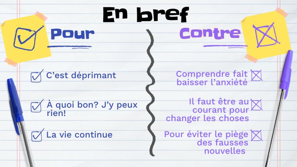 C’est prouvé par des études: quand on saisit bien un enjeu, le niveau de stress diminue. C’est l’inconnu et l’incompréhension qui font peur. Être informé t’aide à te sentir plus en contrôle. En plus, on fait bien attention à ce qu’on écrit, et on ne publie pas d’images choquantes. On te donne l’essentiel de la nouvelle, point.