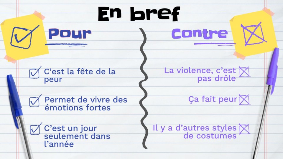 Les feuilles tombent, des citrouilles décorées apparaissent devant les maisons… ça sent l’Halloween! As-tu déjà choisi ton costume? Peut-être as-tu abandonné ton projet de te déguiser en poupée tueuse, parce que ton école interdit les costumes avec du faux sang ou des armes. Tu en penses quoi, toi, de ce genre de costume? Regardons ensemble les arguments POUR et les arguments CONTRE les costumes violents à l’Halloween.
