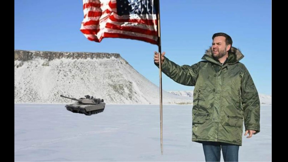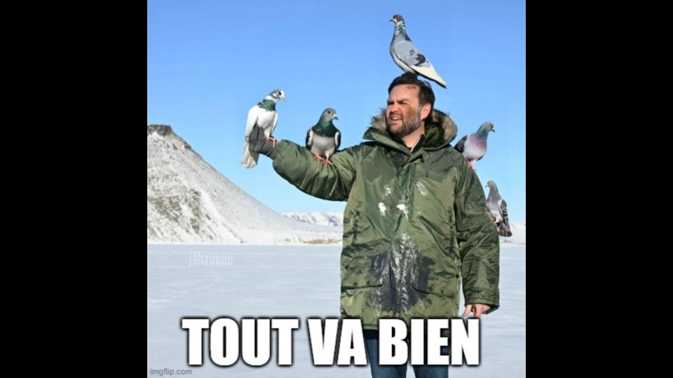 Cette photo a été prise lors du voyage controversé du vice-président américain J.D. Vance au Groenland. Les États-Unis ont clairement annoncé leur intention de s’emparer de ce territoire appartenant au Danemark pour ses minéraux et son emplacement stratégique. Comme tu peux t’en douter, les habitants du Groenland ainsi que le Danemark sont vivement en désaccord avec cette idée. Cette photo a inspiré de nombreuses blagues.
