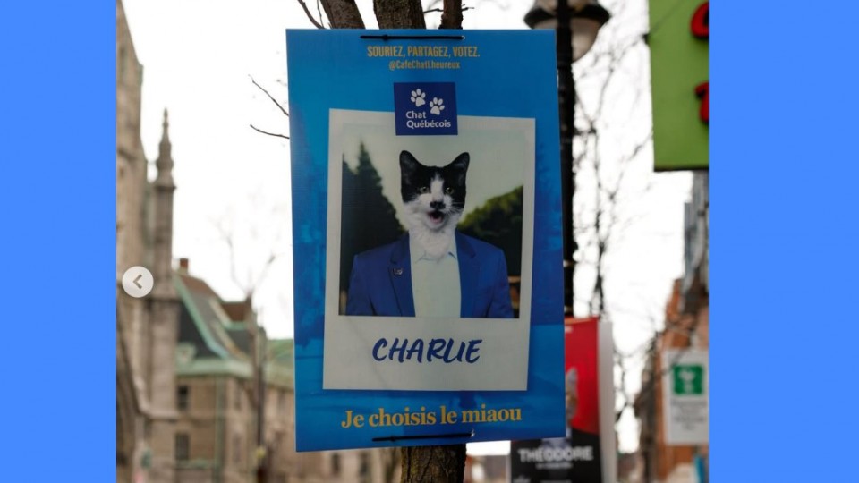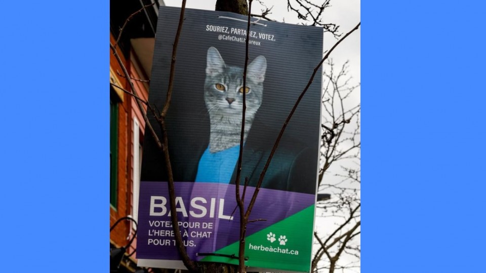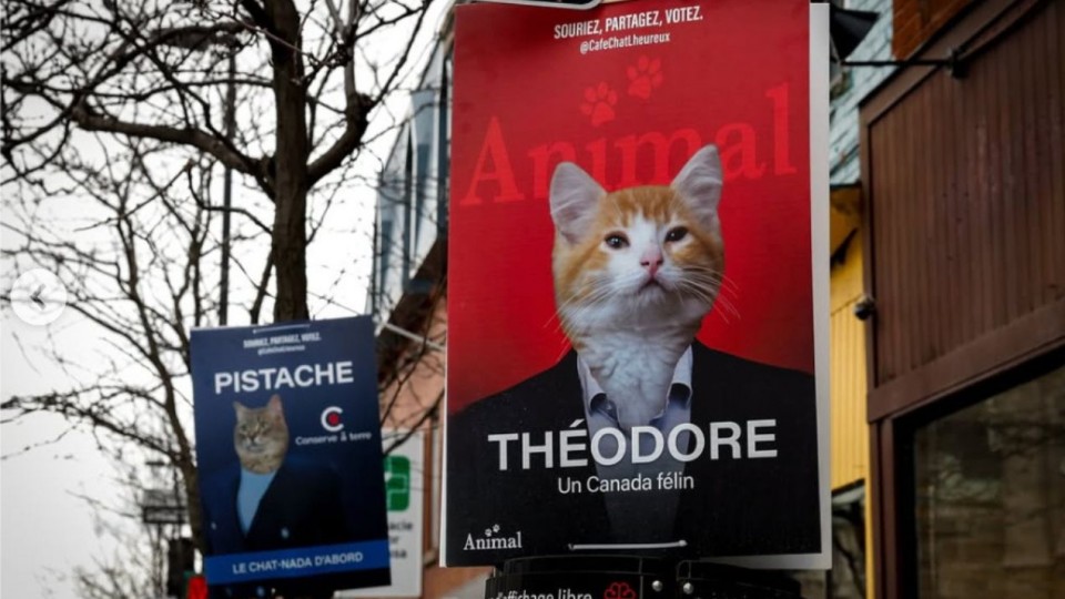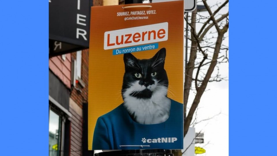 La semaine dernière, des affiches électorales assez spéciales sont apparues sur la rue Ontario, à Montréal. Les chats Luzerne, Pistache ou Basil, en veston et cravate, invitaient les gens à voter pour eux. Ces candidats humoristiques sont l’idée du Café Chat L’Heureux, un restaurant où des chats se promènent parmi les clients. Malheureusement, ces pancartes ne respectent pas les règles électorales et ont été retirées. Clique sur la flèche à droite pour faire défiler les photos.