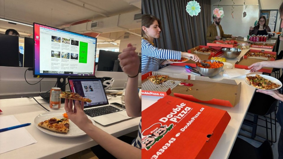 Comme tu peux le voir, on a pris le temps de prendre des forces! ;-) On mange de la pizza. C’est une tradition dans beaucoup de salles des nouvelles les soirs d’élection. Nos collègues du Droit et du Devoir sont aussi en train de manger de la pizza!