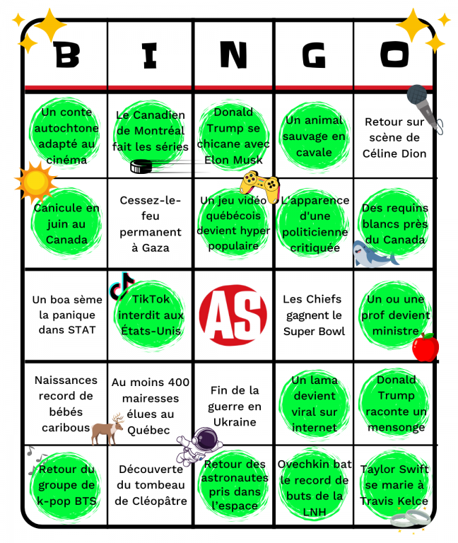 C’est un jeu qu’on a créé au début de l’année pour suivre les actualités! En janvier, les journalistes des As de l’info ont fait quelques prédictions sur les nouvelles qui pourraient survenir en 2025. Et chaque mois, on t’explique ce qui est devenu réalité! Lorsqu’on aura une ligne remplie, on pourra crier… BINGO!