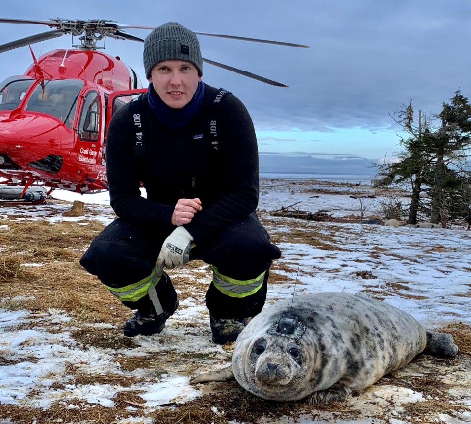 Xavier et un phoque gris. Tu peux voir un émetteur installé sur la tête du phoque. Eh oui! Les phoques aussi sont suivis!