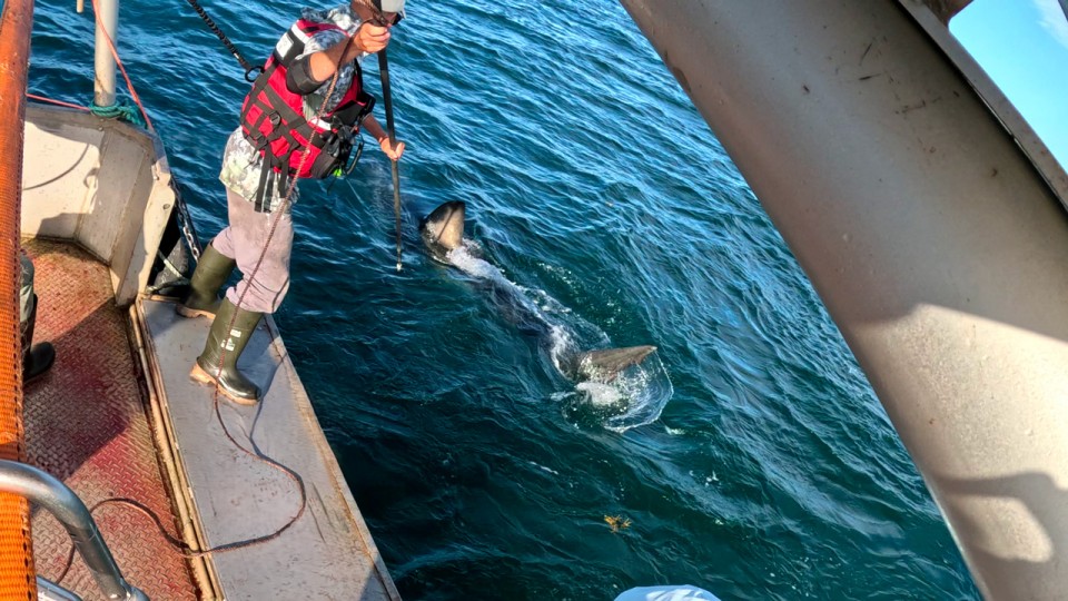 Avec la perche, un scientifique installe un émetteur sur un requin.