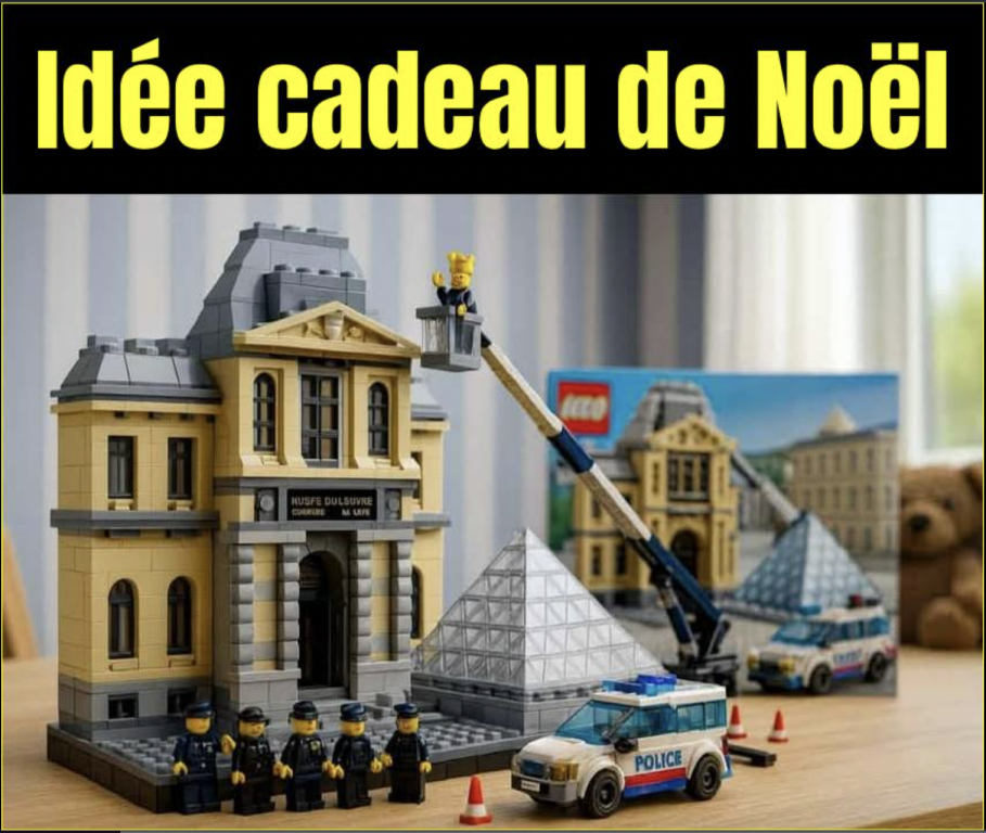 Ici, on te propose une idée de cadeau de Noël un peu spéciale: un ensemble LEGO pour rejouer le fameux vol du musée. Pyramide, policiers, camion avec une échelle.. Tout y est! Parfait pour s’amuser à rejouer le vol de l’année… sans finir en prison! 😆