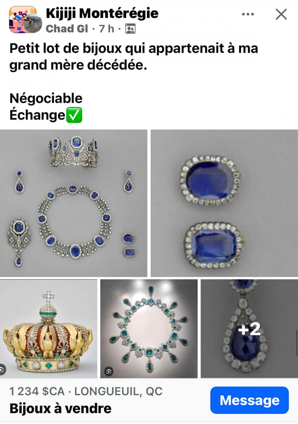 Cette fausse annonce de vente a repris les photos des bijoux volés, comme si c’était les voleurs eux-mêmes qui essayaient de revendre leur butin!