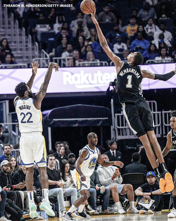 Victor Wembanyama (qui mesure 2 mètres 24!) s’étend de tout son long et bloque un tir.