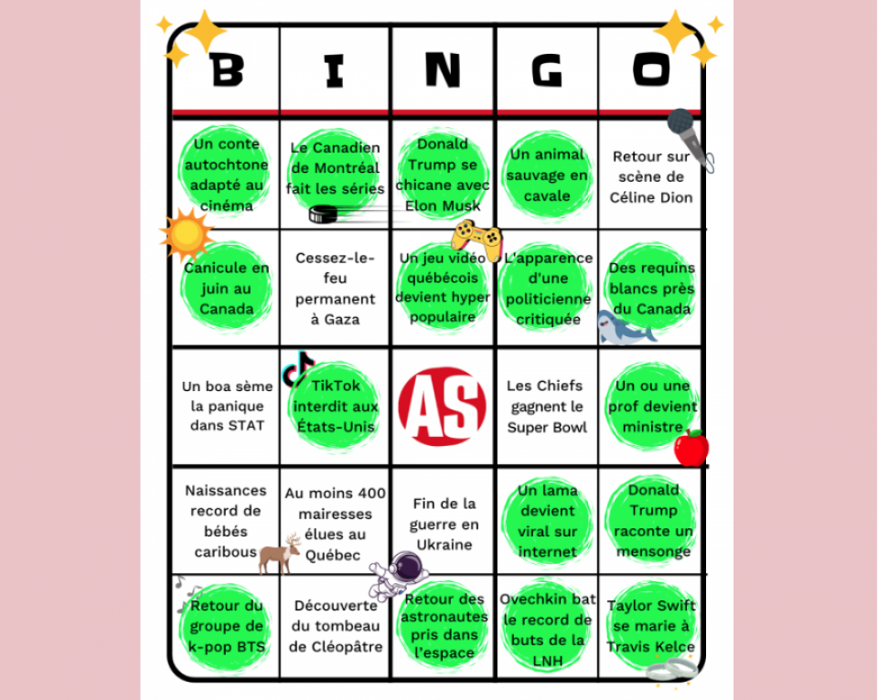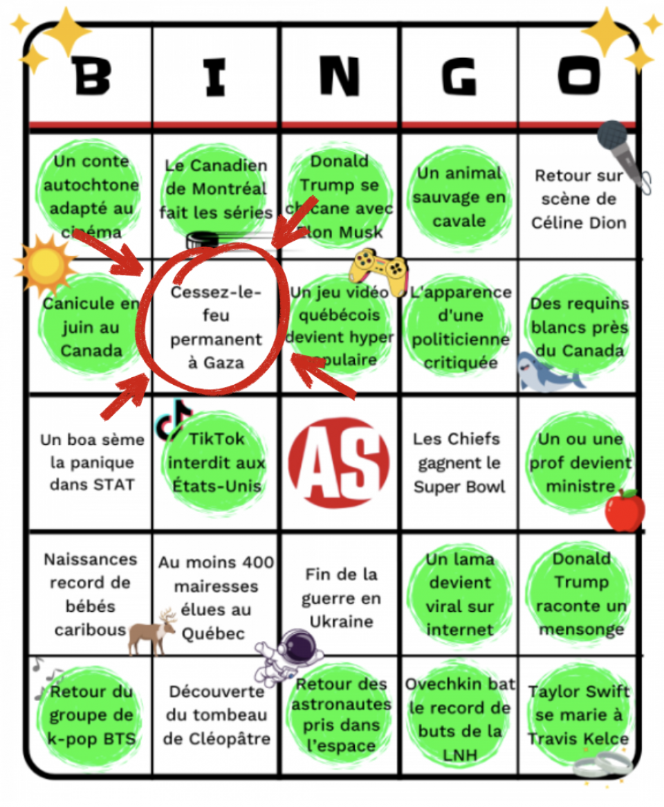 Comme tu le sais #1: depuis janvier, on a un bingo de l’actualité. Ça veut dire qu’au lieu des chiffres, notre carte de bingo contient des prédictions. C’est ce qu’on croyait (ou espérait) qu’il allait arriver en cours d’année. Chaque mois, on regarde ce qui s’est produit et on met un jeton sur les prédictions qui se sont réalisées. Le 1er octobre, notre carte ressemblait à ça 👇