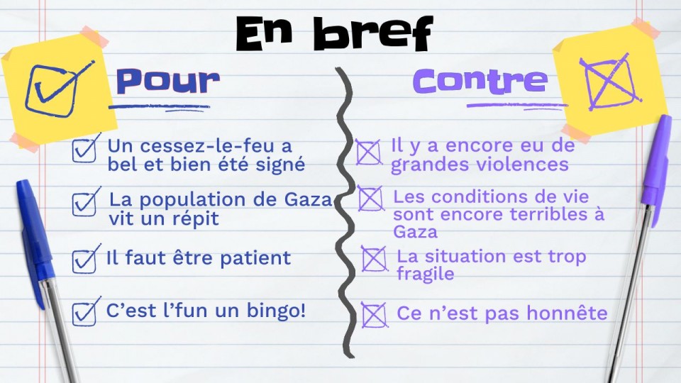 Cette semaine, notre POUR ou CONTRE est aussi un sondage. On a besoin de réfléchir avec toi sur un sujet délicat: y a-t-il un cessez-le-feu à Gaza qui mérite qu’on mette notre jeton sur la carte de bingo? Oui je sais, ça sonne un peu bizarre. Mais c’est sérieux. Je t’explique!