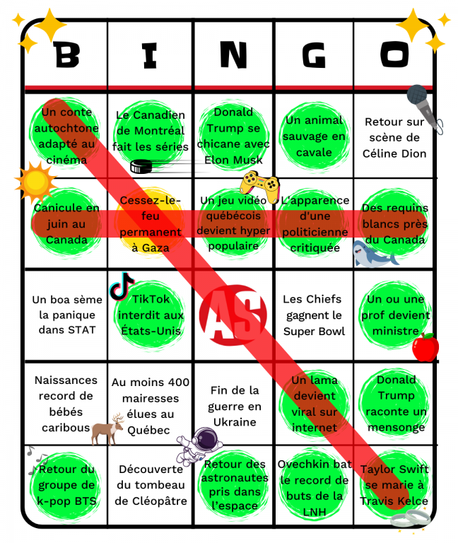 C’est un jeu qu’on a créé au début de l’année pour suivre l’actualité! En janvier, les journalistes des As de l’info ont fait quelques prédictions sur les nouvelles qui pourraient survenir en 2025. Et chaque mois, on t’explique ce qui est devenu réalité! Lorsqu’on aura une ligne remplie, on pourra crier… BINGO!
