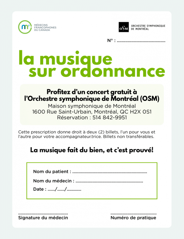 Sachant tous ces bienfaits, l’OSM et Médecins francophones du Canada ont eu une idée: prescrire… des concerts! Grâce à ce projet, des médecins pourront offrir à certains de leurs patients un billet gratuit pour un concert de l’OSM, qu’ils pourront aller voir avec une personne de leur choix.