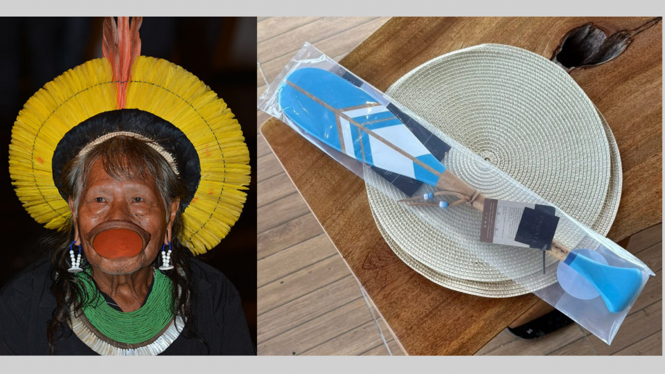 C’est une tradition chez les Wendats d’offrir des présents à d’autres Autochtones. Hadishrayen a offert une pagaie au chef Raoni. Elle représente l’avancement et la protection de l’eau.