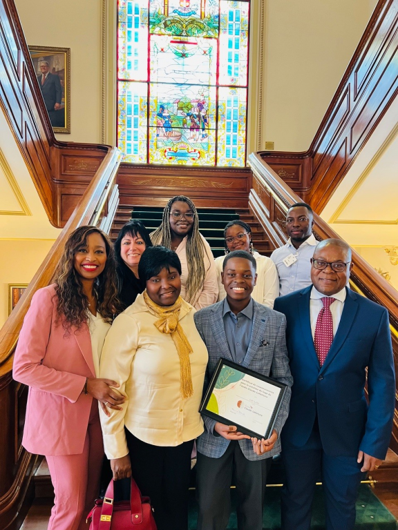 Liël en compagnie de la députée Shirley Dorismond, de ses parents, de son ancienne enseignante Madame Cathy et d’autres membres de sa famille.