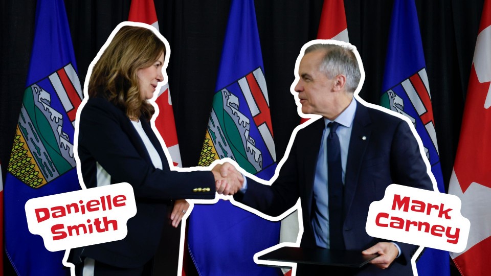 L’image a été prise jeudi, après la signature d’une grosse entente. Mark Carney a donné la permission à l’Alberta de construire un oléoduc. S’il est construit, il transportera du pétrole de l’Alberta en passant par la Colombie-Britannique.