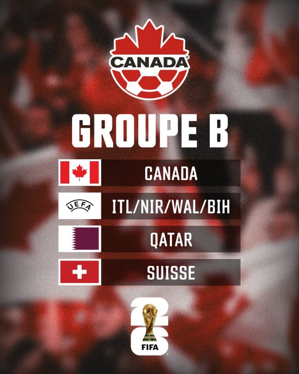 On connaît désormais quelles équipes affronteront le Canada à la Coupe du monde de soccer 2026. Parmi ses adversaires, on retrouve le Qatar, la Suisse… et une équipe européenne encore à déterminer. Quatre équipes peuvent encore obtenir cette dernière place: l’Italie, l’Irlande du Nord, le Pays de Galles et la Bosnie-Herzégovine.