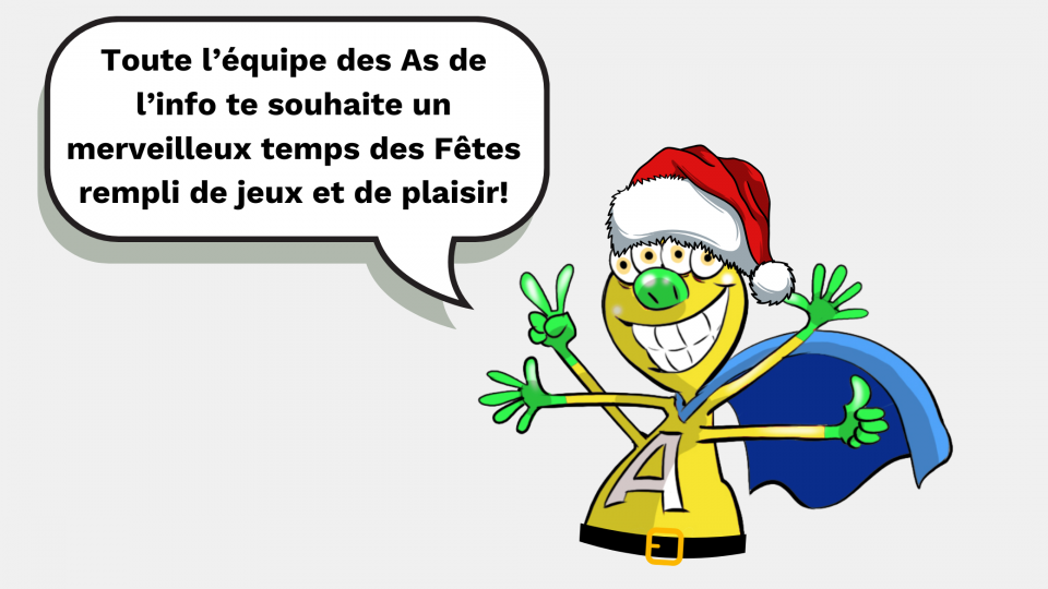 Plus que quelques jours avant les vacances! As-tu hâte? De son côté, l’équipe des As travaille fort depuis quelques semaines pour te préparer un programme spécial pour les Fêtes. Au menu? De quoi t’informer et t’amuser pendant le congé! Je te donne toutes les infos!