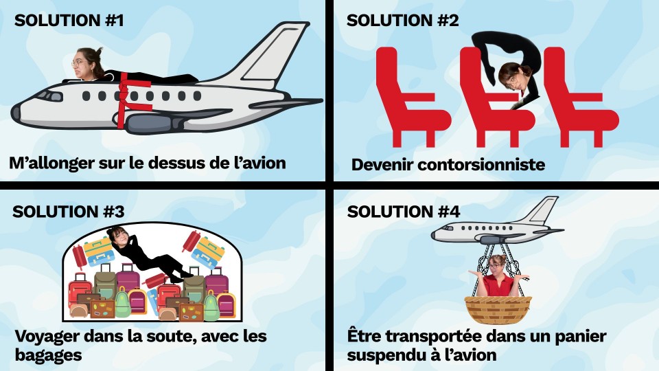Moi, je suis TRÈS grande (1 mètre 87). Alors j’ai imaginé un petit diagramme pour m’aider à trouver une position confortable, si je voyage avec WestJet un jour.