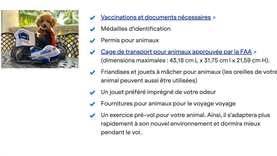 Depuis cette histoire, on peut voir JetBlue portant une cape de superhéros sur le site de la compagnie aérienne qui porte le même nom que lui. La photo se trouve à côté de la liste de vérification pour voyager avec un animal de compagnie. Ça donne envie de ne rien oublier 😉!