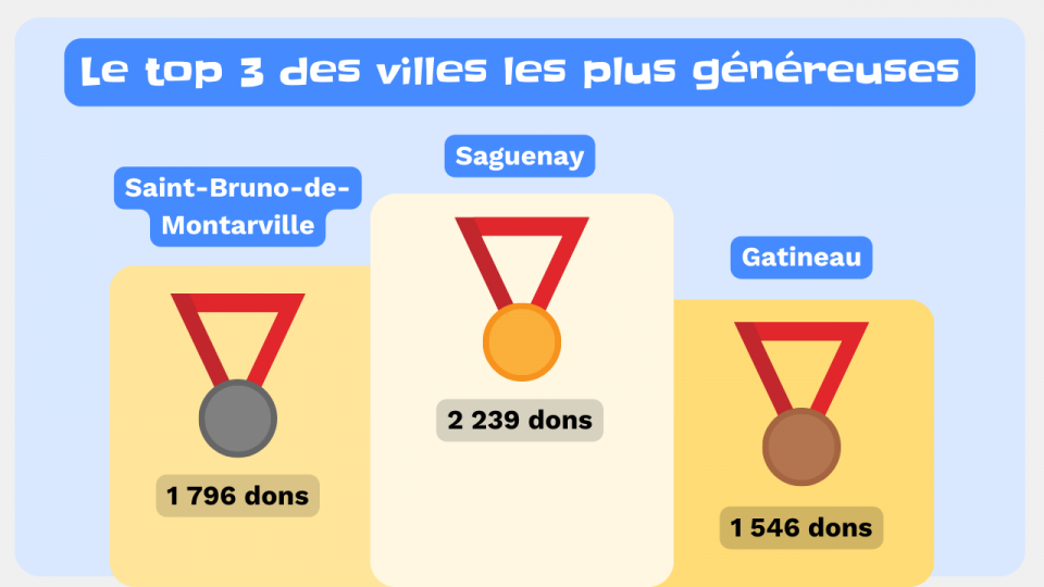 Le top 3 des villes avec le plus grand nombre de dons sont Saguenay, Saint-Bruno-de-Montarville et Gatineau! Elles ont accumulé un total de 5 581 dons à date, soit près de la moitié de tous les dons faits dans le cadre du défi Plasma olympique!👏👏👏