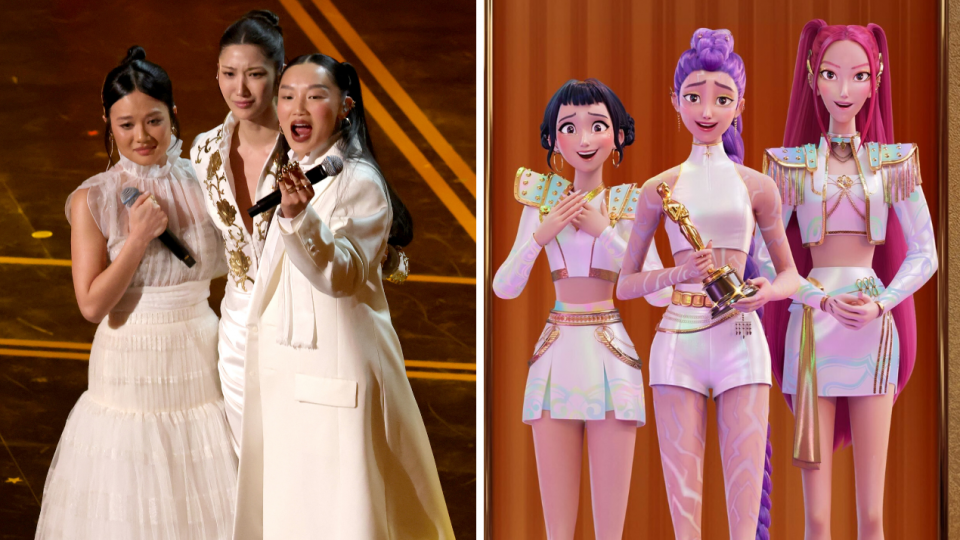 Les chanteuses qui ont prêté leurs voix à Rumi, Zoey et Mira ont transformé la cérémonie en concert de HUNTR/X le temps d’une chanson! Voici leur performance de Golden (et oui, ce sont bien des vedettes d'Hollywood qui agitent les bâtons de lumière dans le public!):