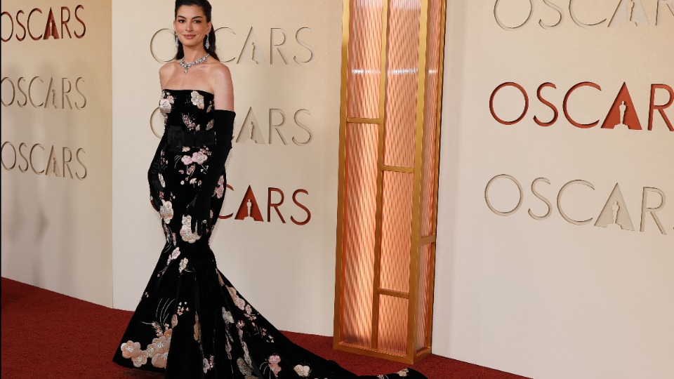L’actrice Anne Hathaway portait une robe florale de la maison de haute couture Valentino.