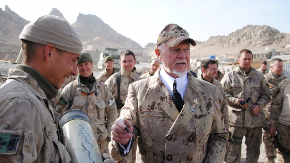 Don Cherry est une personnalité très aimée dans le Canada anglais. Il y a même eu un film sur sa vie! Ici, on le voit visiter des soldats canadiens en mission en Afghanistan, le jour de Noël 2010.