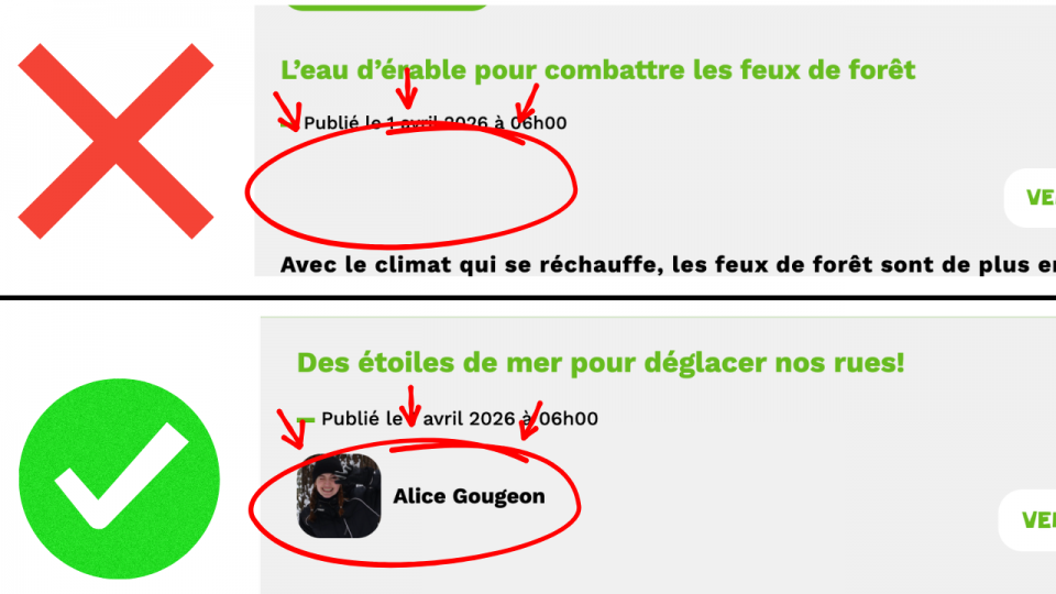 Un article de nouvelles doit être signé par le journaliste qui l’a écrit. Dans de rares cas, par exemple s’il y a plusieurs auteurs, on peut aussi voir le nom du média ou d’une équipe de journalistes. Mais hier, notre fausse nouvelle sur l’eau d’érable n’était pas du tout signée:
