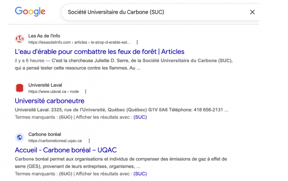 Un truc: cherche le nom des experts ou des organisations mentionnées sur internet. Par exemple, quand on cherche Société Universitaire du Carbone (SUC) sur Google, on ne tombe que sur notre article. On se rend vite compte que ça n’existe pas!