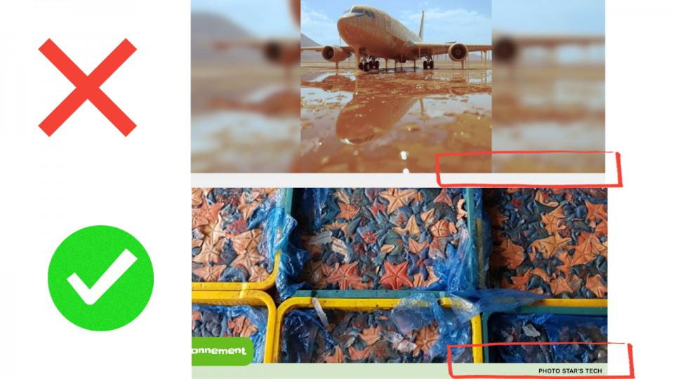 Quand on utilise une photo pour illustrer une nouvelle, on doit indiquer d’où elle vient. Normalement, le nom du photographe et de son entreprise se trouve sous l’image. Si l’image a été trouvée sur internet, il y aussi moyen de l’indiquer: capture d’écran, compte Facebook, Instagram, etc. Mais dans notre faux article, tu peux voir qu’aucune photo n’a de source. C’est louche!
