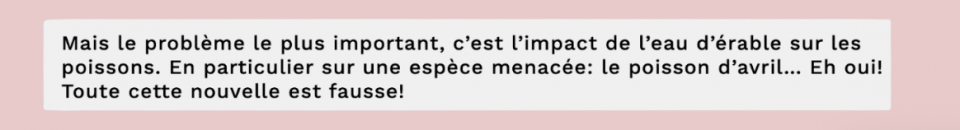 Alors, t’es-tu fait prendre par notre nouvelle sucrée ET FAUSSE d’hier? Celle où on t’annonçait que l’eau d’érable allait servir à combattre les feux de forêt? Eh oui! C’était un autre fameux poisson d’avril de l’équipe des As! On te dévoile aujourd’hui les indices qui permettaient de détecter qu’on te jouait un tour!