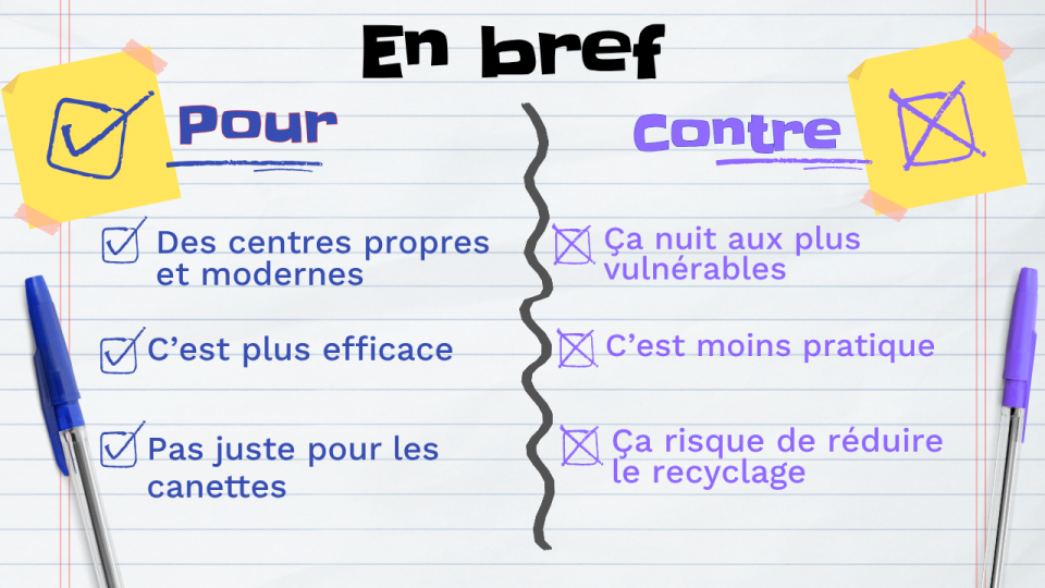 Il y a de l’action dans le monde de la récupération! Au Québec, de moins en moins d'épiceries ont de gobeuses, ces machines où on peut rapporter les canettes vides. Dorénavant, il faudra les porter dans les nouveaux centres de tri Consignaction. Même si ces centres sont modernes et pratiques, ce changement crée de l'inquiétude. Pourquoi? Voici les POUR et les CONTRE remplacer les gobeuses par des centres de tri.