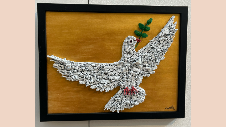 Mon coup de cœur à moi, c’était cette œuvre, qui représente une colombe. Savais-tu que c’est le symbole de la paix? En le regardant de plus près, on réalise que l’oiseau est constitué de tout plein d’objets qui rappellent la guerre, comme des armes et des bombes. L’artiste fait référence à Donald Trump, le président des États-Unis, qui dit vouloir la paix, mais qui recourt régulièrement à la violence…