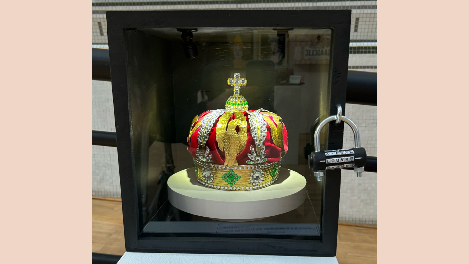 En octobre 2025, quatre cambrioleurs ont dérobé pour plus de 140 millions de dollars en précieux joyaux au Musée du Louvre, à Paris. Mais dans leur fuite, ils ont échappé une couronne. La créatrice de cette œuvre a recréé la fameuse couronne et l’a mise en sécurité dans un coffre cadenassé. Mais si tu regardes bien le cadenas, tu peux lire le codepour ouvrir la boîte: LOUVRE! C’est parce qu’après le vol, on a découvert que le mot de passe des caméras de surveillance du musée était… Louvre. Pas très top secret!