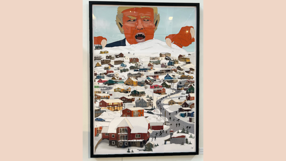 Sur ce tableau intitulée Toc toc toc, c’est le grand mechant Trump, on aperçoit Donald Trump qui prend les traits d’un loup menaçant. Remarques-tu ses griffes aiguisées et ses crocs acérés? Il semble prêt à souffler très fort sur le village de Qaqortoq, au Groenland. Cette image forte fait référence à toutes les fois que Donald Trump a affirmé vouloir prendre le contrôle de cette île. Comme quoi dans la vraie vie comme dans les contes, les plus forts essayent parfois de prendre le dessus sur les plus petits.