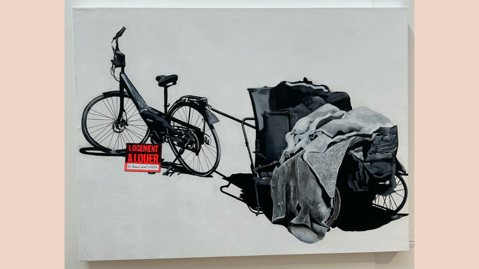 Cette peinture parle de la crise du logement et de l’itinérance. On y voit un vélo avec une petite remorque et une affiche où il est écrit «logement à louer».