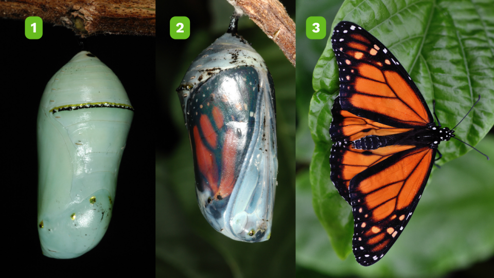 Clique sur la flèche à droite pour voir le cycle de vie du monarque! 👇
