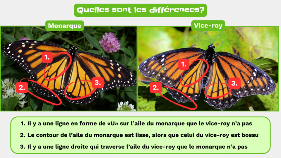 Il existe un papillon qui ressemble beaucoup aux monarques: le vice-roi. C’est une ruse: comme les monarques sont toxiques, ça permet au vice-roi d’échapper à ses prédateurs! Impressionnant, non?