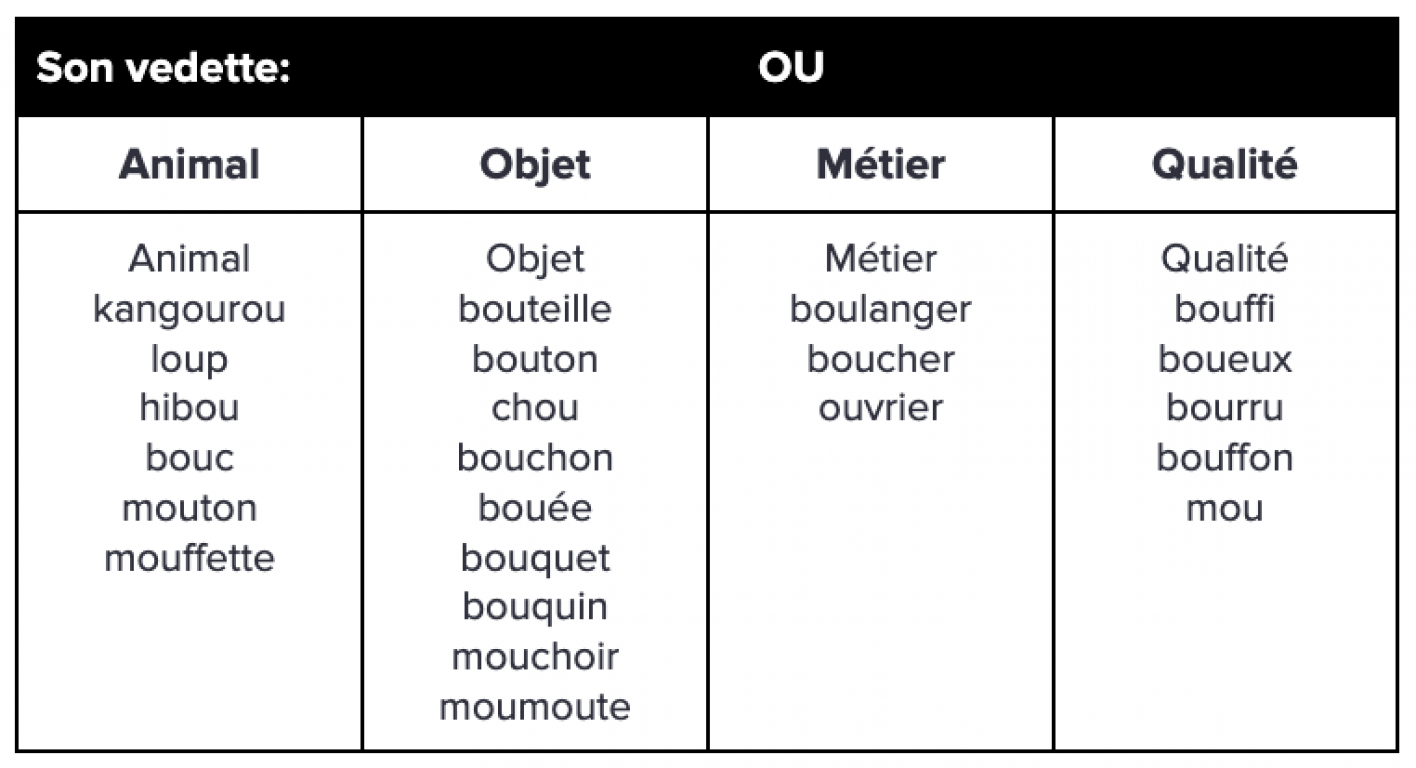 Proposez aux élèves de constituer un champ lexical de mots contenant le son-vedette de l’équipe. Les élèves peuvent consulter des dictionnaires en ligne tel qu’Usito pour leur permettre de compléter un petit tableau tout simple. La fonction de prédiction de mots dans le dictionnaire en ligne peut faciliter l’émergence des mots comme dans le tableau suivant: