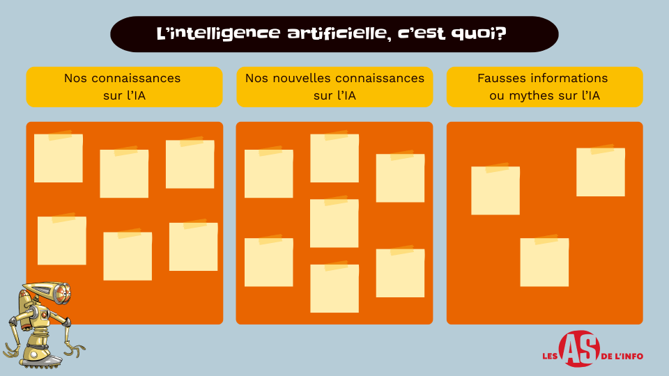 - En équipe, utilisez des Post-it. Les élèves discutent, puis notent chaque connaissance qu’ils ont sur un Post-it différent. Ils les collent dans la catégorie «Nos connaissances sur l’IA».