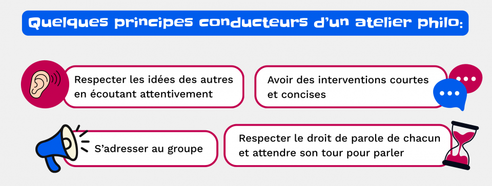 L’objectif d’une discussion philo est de réfléchir, collaborer, échanger et analyser ensemble. Nous sommes bien loin d’un débat où le meilleur orateur gagne! Encouragez plutôt une posture de chercheur, un peu comme des détectives de la pensée qui examinent les idées, les exemples et les arguments. La philo c’est un monde merveilleux où il faut autant prendre le temps de réfléchir à ce que l’on souhaite exprimer, mais aussi réellement porter attention à ce que les autres disent.