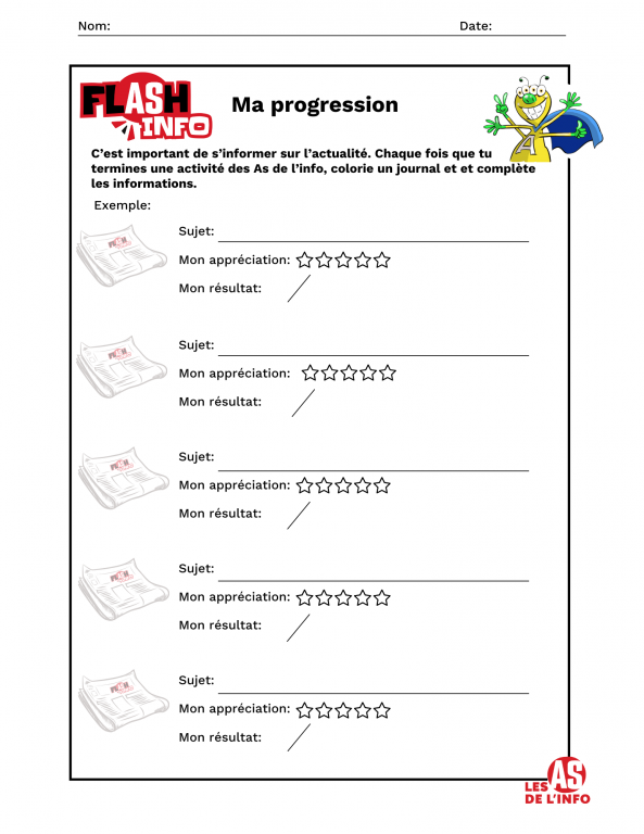 - Faites-en une bonne habitude! Chaque semaine, mettez au programme la lecture d’un Flash Info. Utilisez le document «Ma progression» pour motiver vos élèves et mesurer leur avancée.