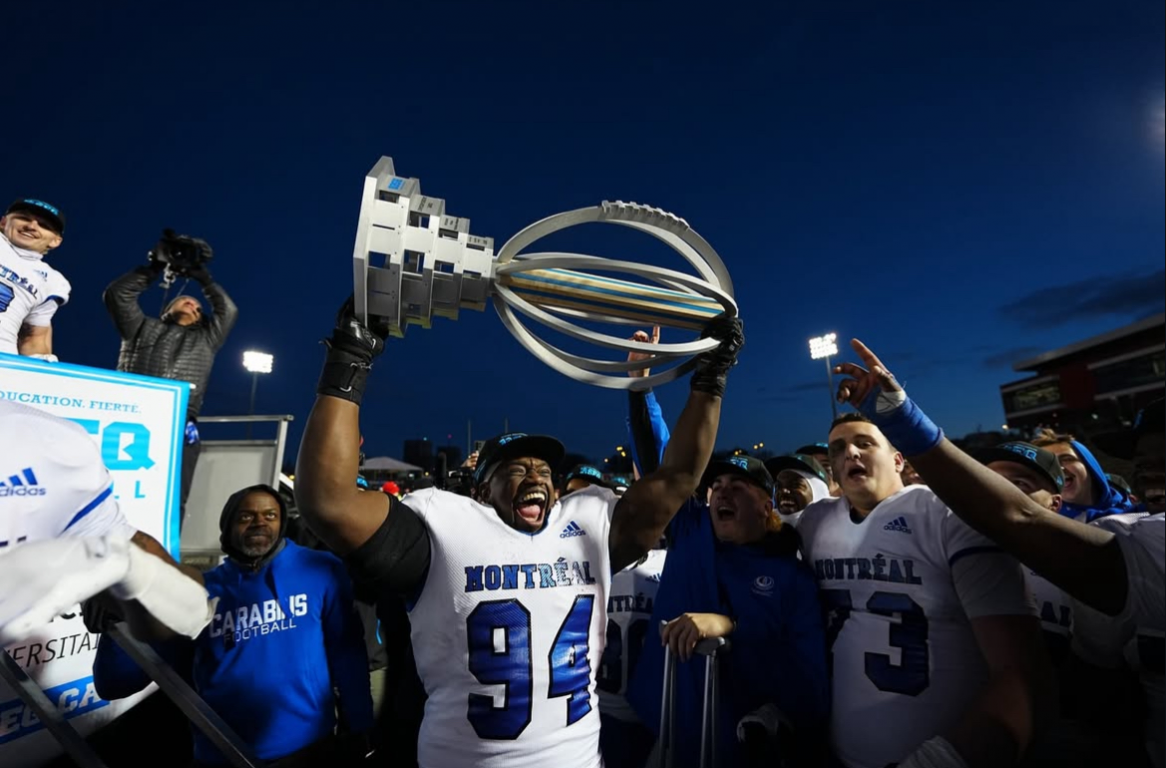 Ayman Cissé des Carabins de Montréal soulève la coupe Jacques-Dussault à Québec.