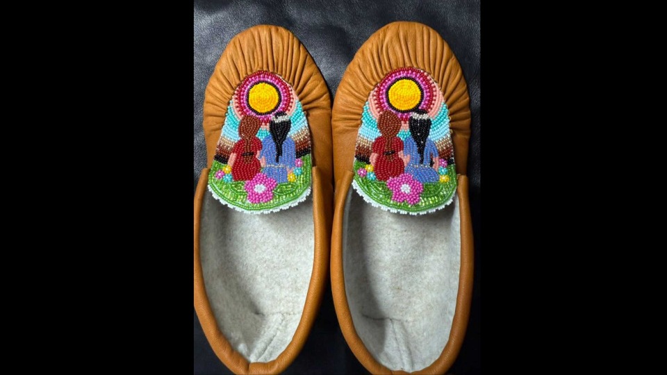 Chaque motif brodé sur le mocassin a une signification. Par exemple, pour la Journée nationale de la vérité et de la réconciliation, la sœur de Gabrielle a décoré un mocassin avec deux femmes assises devant un ciel multicolore.