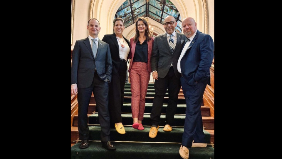 Éric Girard, Kateri Champagne-Jourdain, Geneviève Guilbault, Christopher Skeete et Ian Lafrenière, des député québécois, qui portent fièrement leurs mocassins dans le cadre de Rock your mocs.