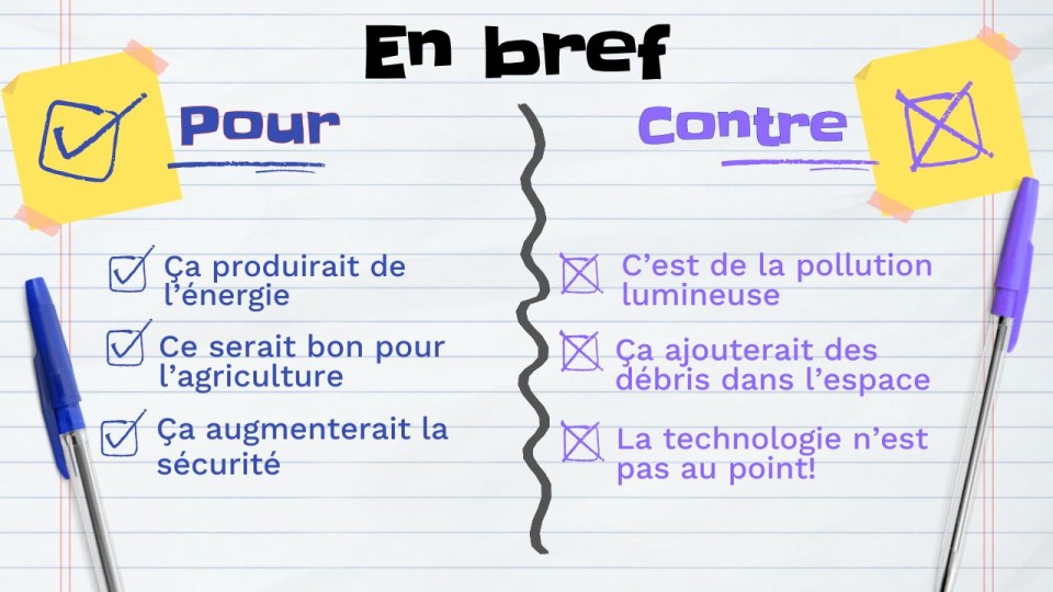 Imagine si c’était possible d’acheter de la lumière du Soleil pour illuminer la nuit. On dirait une phrase tirée d’un roman de science-fiction, non? Mais ça pourrait bientôt être une réalité. Une compagnie américaine veut placer d'immenses miroirs en orbite. Ceux-ci serviraient à réfléchir la lumière solaire sur la Terre afin d’alimenter les panneaux solaires ou d’étirer les journées pendant les récoltes, par exemple. Mais est-ce que c’est une bonne idée? C’est un beau sujet de POUR ou CONTRE!