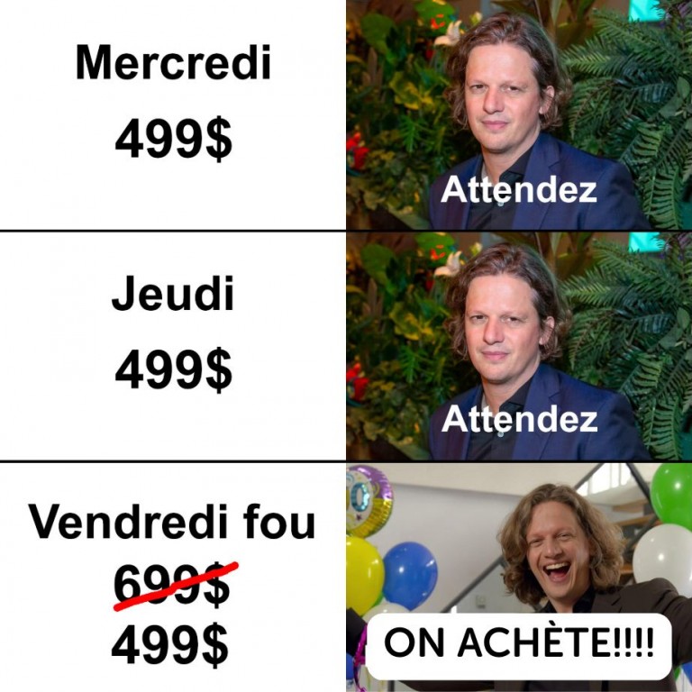 Pssst! L’homme sur ces images s’appelle Pierre-Yves McSween! C’est un comptable et un animateur québécois qui parle d’argent de façon simple et amusante. Dans les médias, il explique comment mieux gérer son argent au quotidien. Je ne pense pas qu’il aurait vraiment suggéré de profiter de ce «super rabais»! 😂