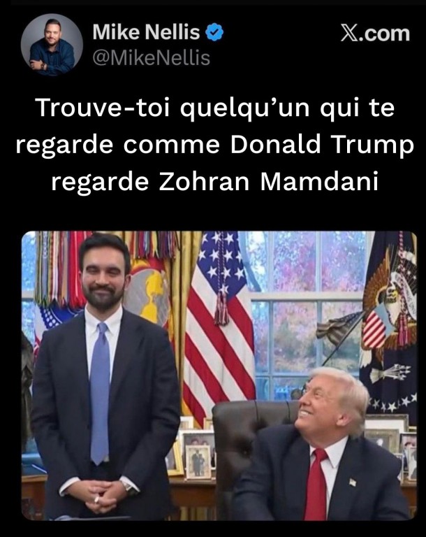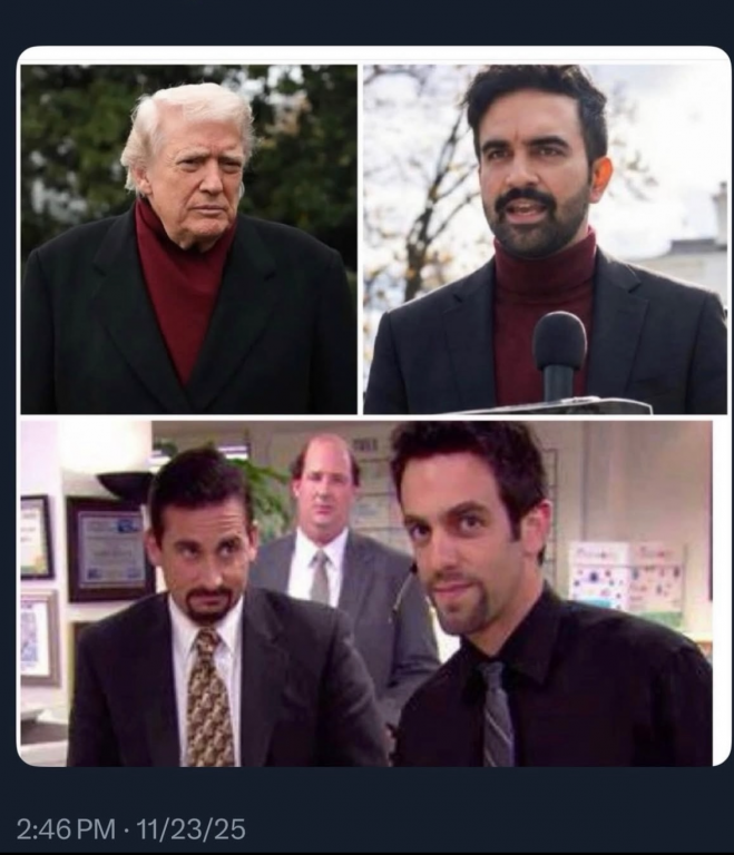 The Office a encore frappé! Dans ce mème, Ryan et Michael remplacent Trump et Mamdani dans le bureau de la Maison Blanche! Visiblement, la rencontre entre Mamdani et Trump est, elle aussi, une véritable mine d’or à mèmes! J’ai déjà hâte à leurs retrouvailles!