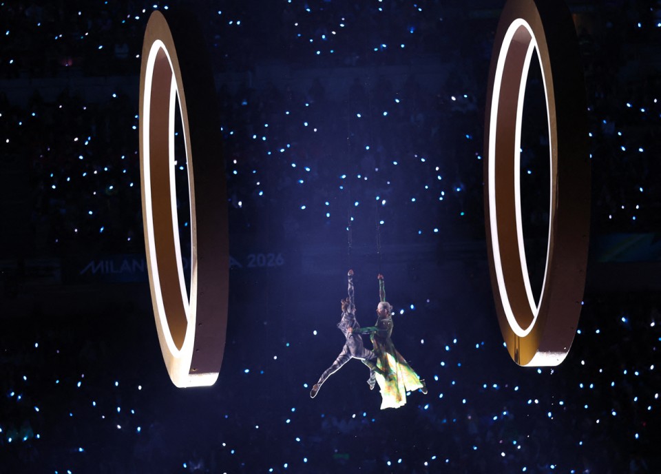 Une des particularités de ces jeux d’hiver, c’est qu’ils se déroulent sur plusieurs sites. Certaines épreuves sont en ville, à Milan. Et d’autres, dans les montagnes, à Cortina à plus de 400 kilomètres. Dans une très belle chorégraphie, deux danseurs représentant la ville et la montagne se sont réunis au-dessus de la scène.