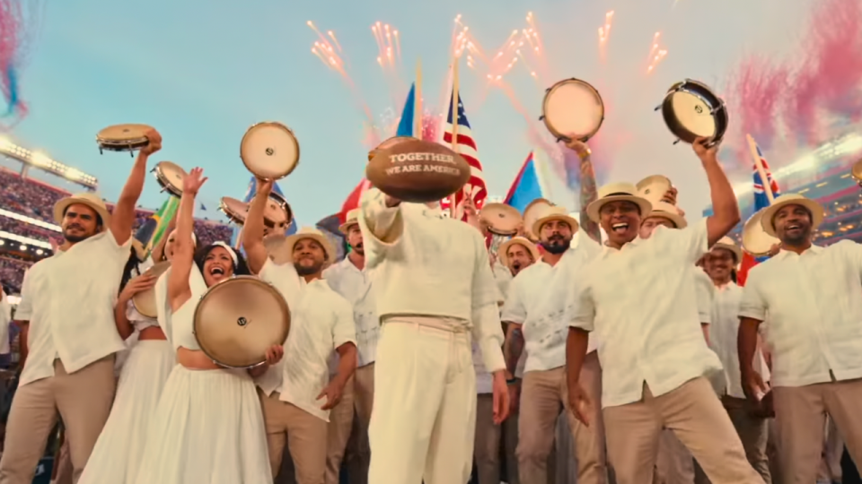 À la fin de sa performance, Bad Bunny, un ballon de football à la main, a déclaré : «God Bless America» («Que dieu bénisse l'Amérique»). Puis, il a énuméré tous les pays des Amériques, du Chili tout au sud, jusqu’au CANADA!!! Derrière lui, les drapeaux de ces pays flottaient au vent. Sur un écran géant, on pouvait lire: «The only thing stronger than hate is love» («La seule chose plus forte que la haine est l’amour»). Puis, le chanteur a tourné le ballon, sur lequel il était écrit: «Together we are America» («Ensemble, nous sommes l’Amérique»).